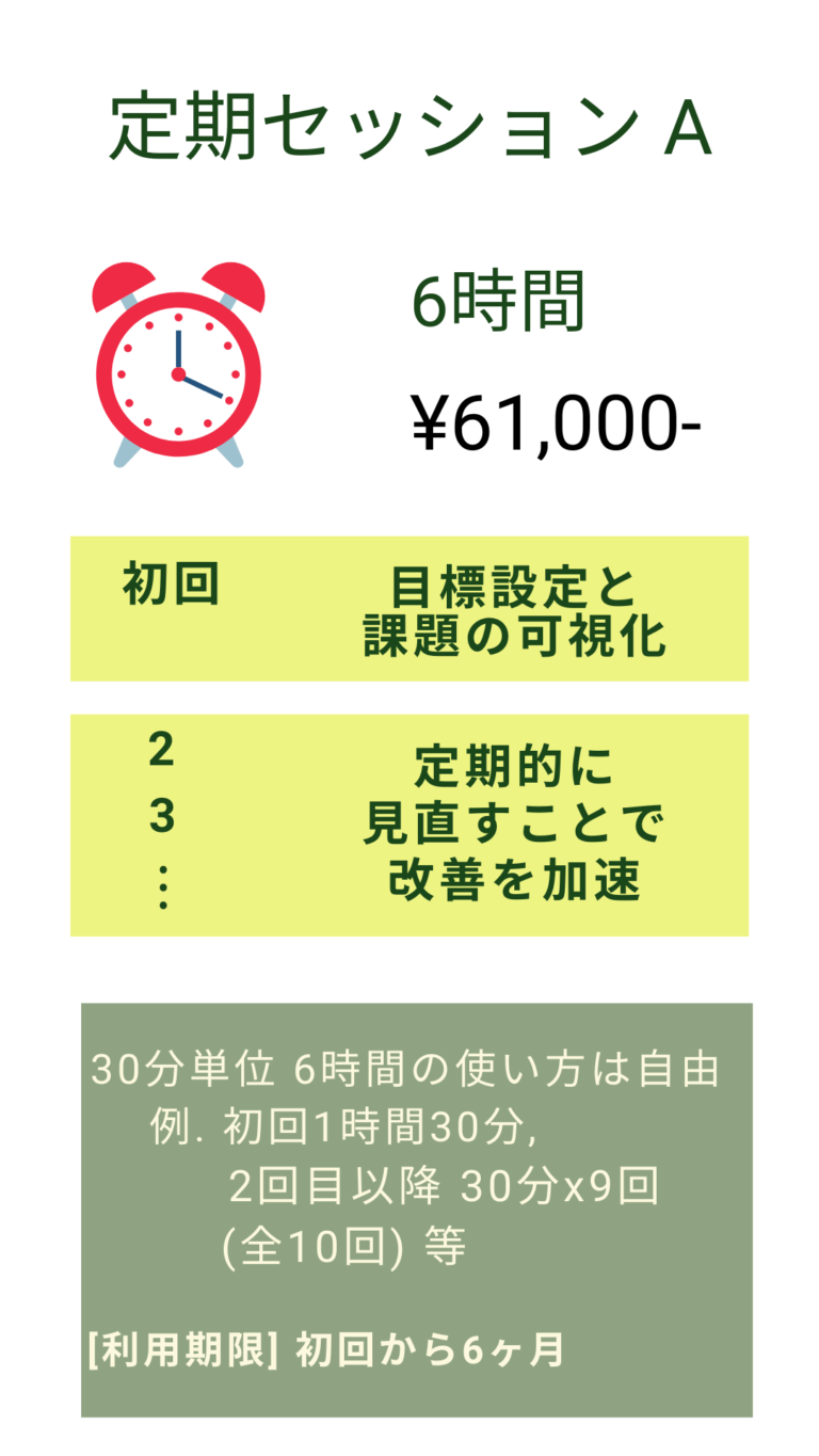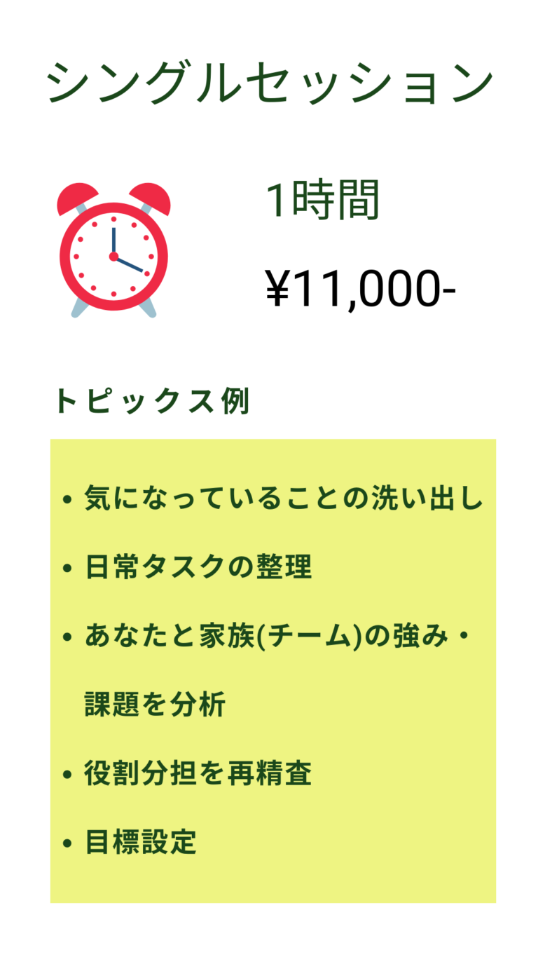 our services ご利用料金 お子さんを持つ親御さまから様々な課題をヒアリング・アドバイスしてきたコンサルタントがあなたの強みと課題を分析軽くなった心と体と経済基盤で新たなステージをスタートさせましょう! 家族構成、家計、体調などもお伺いします。言いたくないことがあっても構いません、詳細に話していただけるとより具体的なご提案ができます。オンライン専用コース心(キャリア・子育て相談)・体(ボディメンテナンス)・経済基盤(フィナンシャルプランニング)を総合的にご提案 定期セッションの方は各回その比重をご自由に選択いただけます ご不明点はお気軽にお問い合わせください! お問い合わせ ご予約